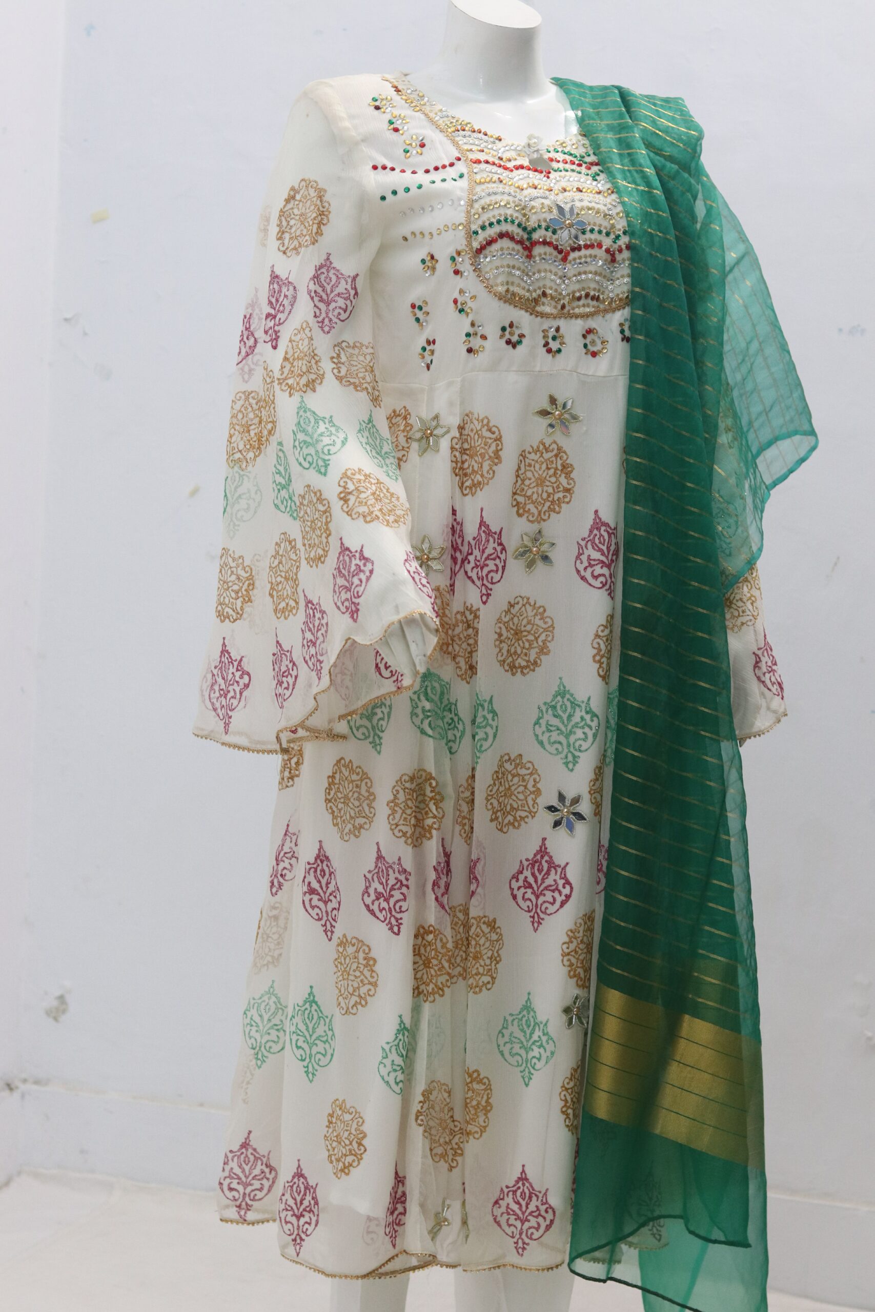 - 3 Piece Indian Chiffon Fabric Block Print Frock, Dupatta & Trousers